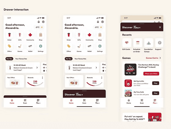 During testing, we anticipated that users would intuitively swipe up to access the Tims+ drawer, but the reality was different. Instead of swiping, most users instinctively tapped, treating it as a standard button interaction. Some missed the feature entirely, reducing engagement with Tims+ offers.
