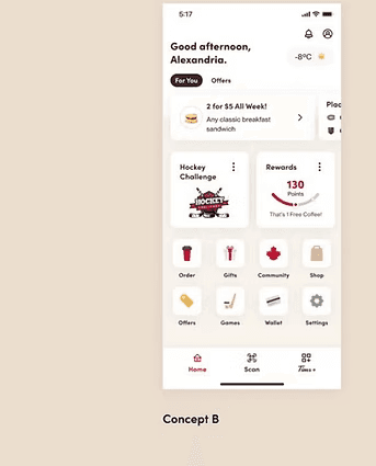 This unexpected insight challenged our design assumptions and led to a key redesign (see concept B below on the right): introducing a visible tap to open "Tims+" CTA on the bottom navigation bar, making the feature more discoverable and significantly improving user interaction.
